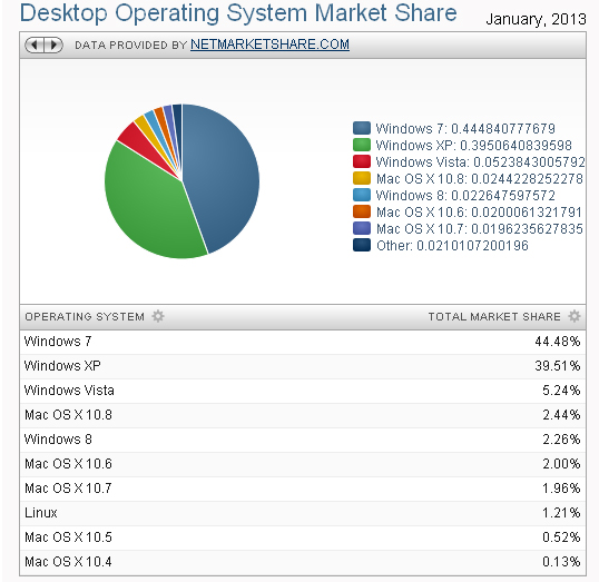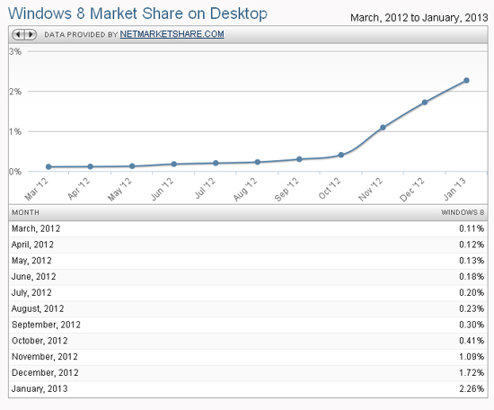 Статистика Net Applications за январь 2013 года показывает рыночную долю Windows 8 на настольных компьютерах. Она составляет всего лишь всего 2,26%.