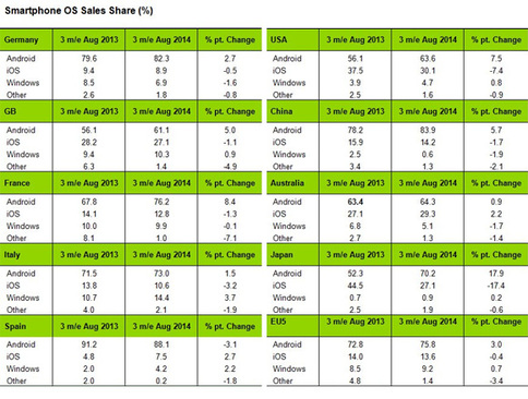 Интересно будет посмотреть на изменение соотношения сил на этих рынках после первых месяцев продаж iPhone 6 и iPohne 6 Plus. В данный период Microsoft достойного конкурента не представила, да и вообще вся политика переименования и отказа от бренда Nokia может наложить свой отпечаток на последующей статистической сводке. Не исключено, что вскоре в ряде стран доля iOS будет увеличена именно за счет пользователей Windows Phone.