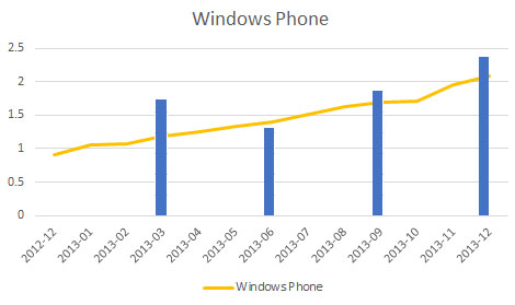 В 2013 году доля Windows Phone на различных рынках стремительно росла, а на некоторых платформа даже обходила своих прямых конкурентов. Аналитическое агентство Statcounter провело в начале года свое исследование, по результатам которого устройства под управлением мобильной ОС от Microsoft генерировали на конец 2013 года 2,08% мирового мобильного трафика. Для сравнения, в конце 2012 года этот показатель составлял 0,91%.