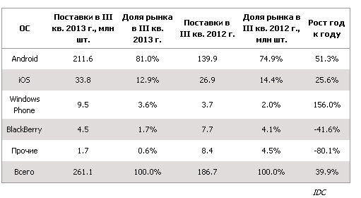 В период с июля по сентябрь поставки устройств на платформе Windows Phone показали самый высокий рост, увеличившись на 156%. В целом же рынок смартфонов вырос на 39,9% до 261,1 млн устройств.