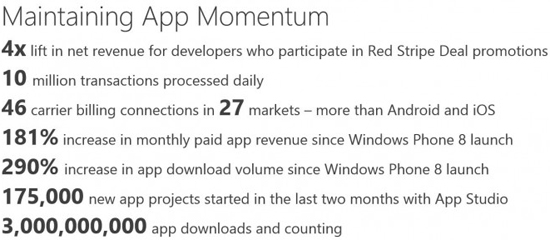 В качестве подтверждения своих слов Брикс приводит следующие данные. Во-первых, из ТОП-25 лучших приложений для iOS и Android у владельцев WP-фонов есть доступ к 84% программ. Во-вторых, Брикс утверждает, что приложения для Windows Phone становятся более качественными: за прошлый год средняя оценка приложения в Windows Phone Store выросла с 3,6 баллов до 3,8. Также в рамках App Studio за последние два месяца было создано 175 тыс. новых проектов, а среднее количество загрузок за день составляет 10 млн или 65 приложений на одного пользователя. Для сравнения, в прошлом году этот показатель составлял 42 приложения на пользователя.