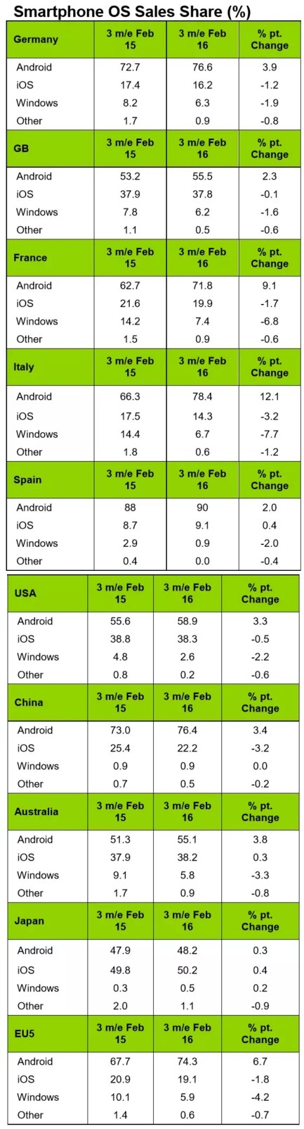 Международная исследовательская компания Kantar опубликовала новый отчёт за три месяца (с декабря 2015 по февраль 2016 года) по состоянию рынка мобильных операционных систем. Согласно этим данным, доля Windows Phone продолжает стремительно падать и сейчас составляет около 5,9% рынка. В прошлом году этот показатель достигал 10,1%, а месяцем ранее - 6,4%. Падение популярности операционной системы от Microsoft наблюдается по всему миру за исключением некоторых регионов, таких как Китай и Япония. В Италии и Франции доля Windows Phone снизилась на 7,7% и 6,8% соответственно.
