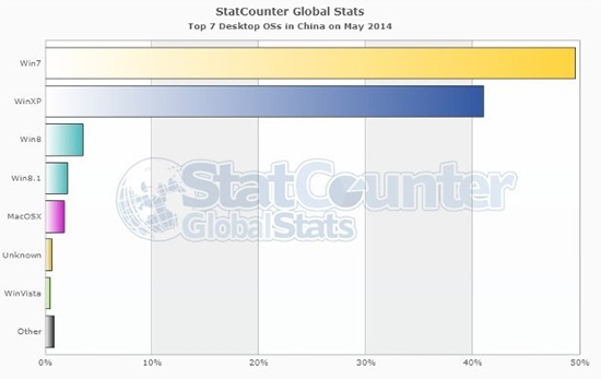 В настоящее время наиболее популярной версией является Windows 7, которая установлена на 49.62% компьютеров в стране, а второе место занимает Windows XP с долей 41.01% – завидно высокий процент, который обеспечивает престижные позиции устаревшей ОС. «Восьмерка» удерживает третье место с распространением в 3.52% среди китайских компьютеров. Более новая версия – Windows 8.1 – имеют долю 2.08%.