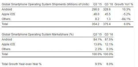 Новое исследование от компании Strategy Analytics показывает, что мобильная операционная система Android продолжает оставаться уверенным лидером на рынке смартфонов с долей 88%, а iOS теряет позиции и получает оставшиеся 12%. Данные взяты по итогам 3-го квартала 2016 года, когда было продано 375 млн. аппаратов, что на 6% выше значения годичной давности. В это число вошли не менее 328,6 млн. Android-смартфонов (+10,3%) и 45,5 млн. моделей iPhone (-5,2%).