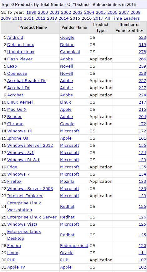 В тройку «абсолютных лидеров» 2016 года по числу уязвимостей также вошли Debian Linux и Ubuntu Linux с 319 и 278 обнаруженными багами, соответственно. Четвертое место досталось мультимедийному плееру Adobe Flash Player с 266 багами, хотя в 2015 году он занимал более высокую третью ступеньку с 329 уязвимостями.