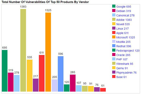 Срез статистики CVE Details топ50 по компаниям вывел в 2016 году на первое место Adobe с суммарным показателем 1383 багов по всем упомянутым в рейтинге продуктам компании (Flash Player, разновидности Acrobat Reader и Acrobat). Второе место досталось Microsoft с ее 1325 багами, на третье место вышла Google (695 ошибок), четвертое и пятое места достались Apple (611) и Red Hat (596).