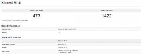 Помимо этого, в бенчмарке GeekBench3 появились результаты тестирования Xiaomi Mi4i под управлением 64-битного восьмиядерного процессора Qualcomm с частотой 1,65 ГГц и 2 ГБ оперативной памяти. Напомним, оригинальная модель работает на четырёхядерном Qualcomm Snapdragon 801 с частотой 2,5 ГГц и оснащена 3 ГБ памяти.
