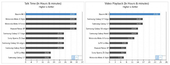 Что касается тестов на время автономной работы, то в некоторых ситуациях Xiaomi Mi5 показал себя лучше большинства конкурентов. Например, в режиме воспроизведения видео аппарат может проработать более 25 часов. Для сравнения, результат Galaxy S7 составляет 16 часов 41 минута.