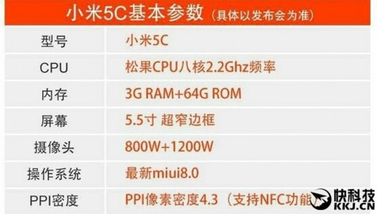 В Сети уже не первый раз появляется информация о готовящемся смартфоне Xiaomi Mi5c. Сегодня стала известна дата анонса и некоторые технические спецификации. Ожидается, что Mi5c получит 5,5” дисплей, 8-ядерный чипсет (Cortex-A53) с тактовой частотой 2,2 ГГц, 3 ГБ оперативной и 64 ГБ постоянной памяти, 12-Мп основную и 8-Мп фронтальную камеры, NFC и ОС Android 6.0 Marshmallow c MIUI 8. По некоторым слухам новинка может оснащаться SoC Pinecone собственной разработки. Другие утечки демонстрируют сканер отпечатков пальцев, встроенный в механическую кнопку, и фронтальную панель со скругленным 2,5D-стеклом. Не исключено, что данная модель будет выпущена сугубо для китайского рынка. Ориентировочная цена составит 999 юаней, а анонс смартфона может состояться 30 ноября. В тот же день запланирована пресс-конференция одного из главных конкурентов - Meizu.