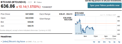 Сервис Yahoo! Finance добавил к валютам, которые отслеживает, виртуальный Bitcoin. Отныне за колебаниями курса можно наблюдать на сайте интернет-компании по тикеру BTC/USD, сообщили пользователи Reddit.
