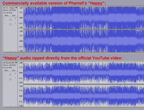 Интересно, что некоторые треки на YouTube теперь звучат лучше, чем на компакт-дисках! Например, вот как выглядит аудио для одной и той же песни, снятое диска (вверху) и снятое с официальной версии клипа для YouTube.