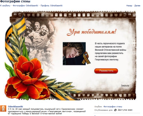 В честь героического подвига ветеранов на полях Великой Отечественной войны сайт Одноклассники предлагает 150 миллионам пользователей в разных странах мира разместить на своей фотографии в социальной сети георгиевскую ленточку. Она будет видна всем друзьям и гостям профиля в течение 7 дней. Получить ленточку бесплатно в указанный период сможет человек в любой точке мира, в любом городе, в любое удобное для него время.