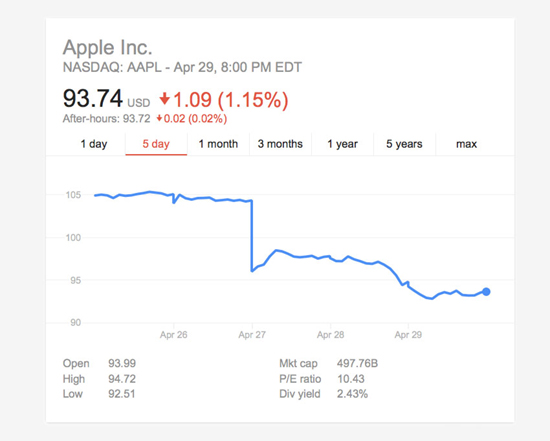 Следует признать, что фондовый рынок пусть и с некоторой задержкой, но отработал «плохие для Apple новости». Если в момент публикации квартального отчёта снижение курса акций купертиновцев ограничивалось долями процента, то в последующие часы они начали резко дешеветь. К настоящему моменту они опустились до $93,7 за штуку, хотя ещё неделю назад стоили не менее $106. За неделю ценные бумаги калифорнийского гиганта просели на 11%.