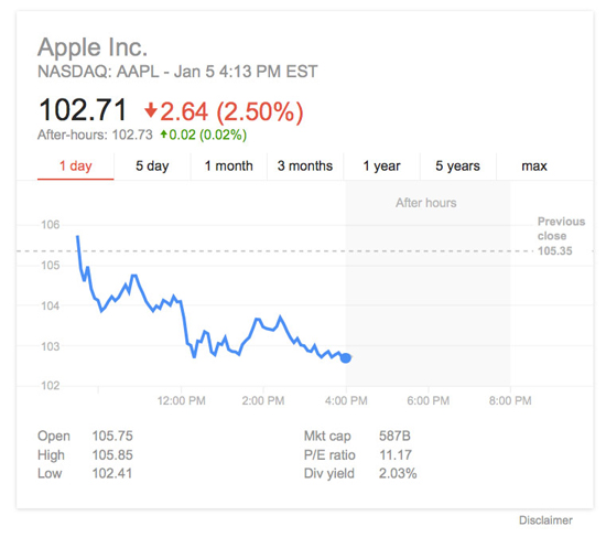 Закрытие торгов 31 декабря показало, что впервые с 2008 года стоимость акций Apple в конце года оказалась меньше, чем в начале. 7 лет подряд ценные бумаги Apple росли год от года, принося инвесторам миллионы долларов. 2015-й запомнится как первый год, по прошествии которого акции подешевели. В течение последних 12 месяцев они ощутили падение на 4,64%, в том числе на 2% за день до конца 2015-го.