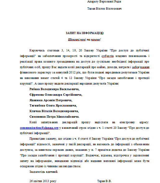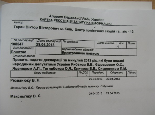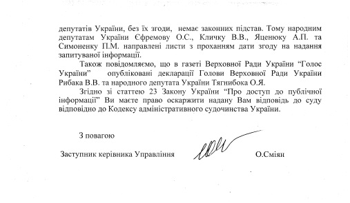 Апарат ВРУ відправив чотири листи зазначеним депутатам, аби отримати від них дозвіл на оприлюднення їх декларацій. Чому чотири? У відповіді на запит йдеться про те, що декларації Рибака В.В. та Тягнибока О.Я. опубліковані в газеті «Голос України», так би мовити, «шукайте їх там». Аналогічною є й реакція Віталія Кличка, який у відповідь посилається на публікацію в газеті. Та згідно з ЗУ «Про доступ до публічної інформації», «відповідь розпорядника інформації про те, що інформація може бути одержана запитувачем із загальнодоступних джерел… вважається неправомірною відмовою в наданні інформації» (ч.2 ст.22). Більш того, в «Голосі України» від 27 та 30 квітня 2013 року розміщені не копії документів, а звичайний переказ відомостей із декларацій.