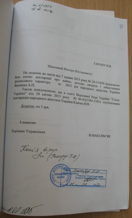 Що цікаво, в матеріалах справи несподівано з’явився новий документ – лист-додаток, який повідомляє про те, що Віктору Тарану надсилається декларація про доходи Арсенія Яценюка.