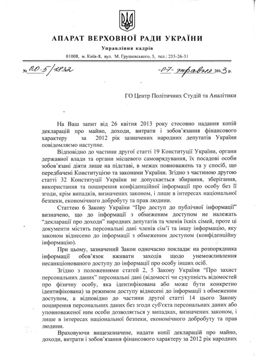 Апарат парламенту відмовився надавати запитані декларації, мотивуючи це конфіденційністю інформації про народних депутатів та членів їх сімей, яку вони в праві пред’явити лише в разі їх особистої згоди.