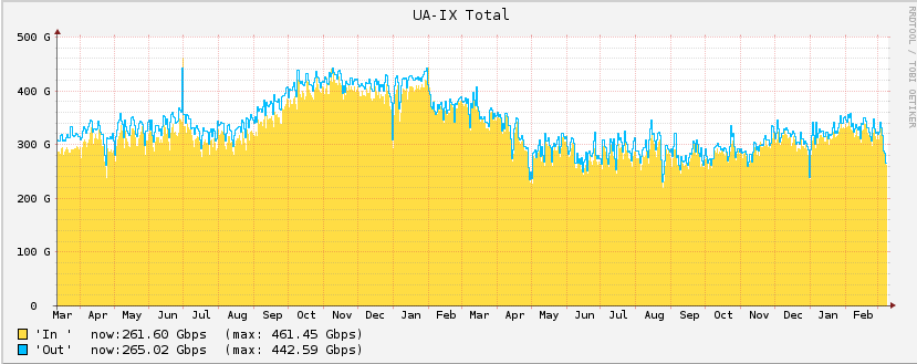 На скриншоте логгера UA-IX видно, что пик роста трафика пришелся именно на февральский съезд ИНаУ. Основываясь на этих цифрах, Сергей Полищук предсказывал дальнейший рост трафика до 500 Gbps к 2014 году, а группа членов ИнАУ предлагала акционировать UA-IX, ввиду необходимости его срочной модернизации. Но с того времени, объем трафика не то что не вырос, но даже немного понизился. Текущая конфигурация UA-IX с большим запасом покрывает все насущные потребности .
