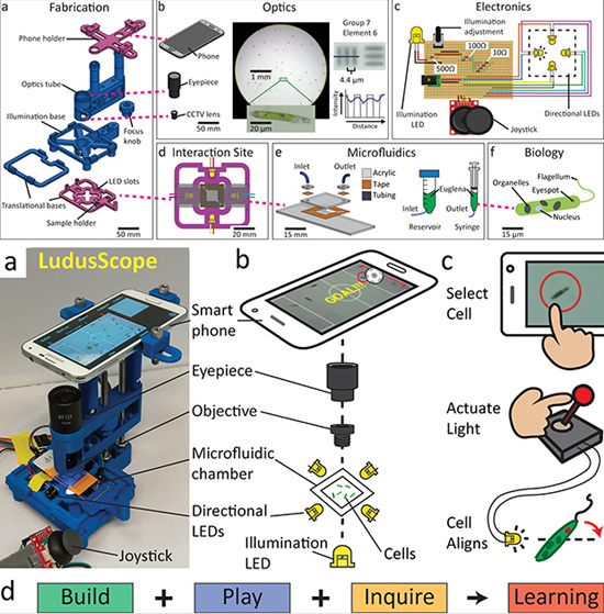 Сотрудники кафедры биоинженерии американского Стенфордского университета создали своеобразную «игровую консоль», которая при помощи смартфона или игрового контроллера позволяет интерактивно взаимодействовать с микроорганизмами. «Игровой» микроскоп, или LudusScope, создан для школьников и студентов-биологов. Состоит устройство из смартфона, съёмных креплений и подставки, напечатанных на 3D-принтере, предметного стекла и столика со светодиодами. За увеличение отвечает CCTV-линза и объектив, размещённые в специальной оптической трубке. Конструкция оснащена игровым джойстиком, а в качестве «персонажей игры» выступают эвглены, одноклеточные организмы, способные реагировать на свет и двигаться в его направлении.