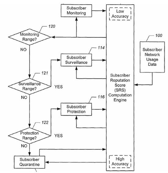 Пользователю на основе его действий присваивается определённый ранг риска — и после дополнительного наблюдения ему могут заблокировать доступ к файлообменным сайтам. Патент называется «Методы, устройства и программные продукты для регулирования сетевой активности с помощью системы ранжирования подписчиков».
