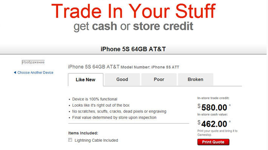 Американская корпорация GameStop предлагает до $580 за бывший в употреблении смартфон iPhone 5S, не анонсированный официально. Речь идет о сервисе, воспользовавшись которым желающие могут получить определенную сумму наличности. Объем выплаты зависит от состояния сдаваемого аппарата.
