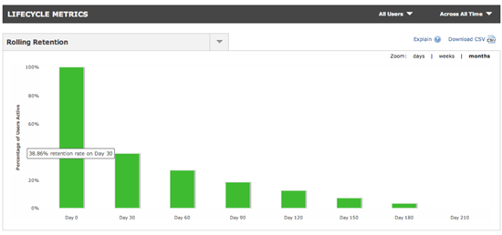 - Возвращаемость в приложение. Большинство приложений через месяц уже никто не открывает, поэтому если у вас показатель retention (возвращаемость) хотя бы 30% — можете тоже смело показывать этот график инвестору. Flurry умеет его показывать без дополнительных настроек.