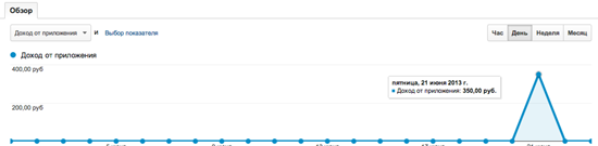 - Желанные оплаты через приложение. Во Flurry можно настроить Event на каждую оплату, в Google Analytics есть прекрасный модуль Электронная торговля. Например, глядя на этот график можно догадаться, что 21го июня фаундеры стартапа отмечали первые прибыли