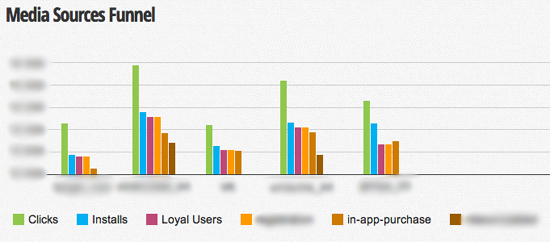 На картинке видно, например, что четвертый и пятый источники дали примерно равное количествво инсталлов, но четвертый намного лучше конвертировался в дальнейшие покупки и лояльных пользователей (тех, кто запустил приложение 3 раза). Графики, конечно, можно выгружать и в виде табличек, и считать ROI с каждого канала.