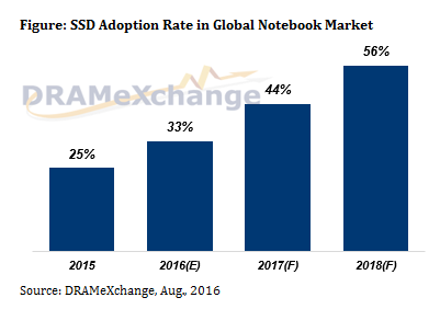Как полагают специалисты TrendForce, по итогам года доля ноутбуков с SSD превысит 30%, а в 2018 году она достигнет 50%. Аналитики отмечают, что наиболее распространенными будут накопители на флэш-памяти TLC NAND. Внедрение моделей с интерфейсом PCIe пока только начинается, а наибольшим спросом пользуются модели с интерфейсом SATA 6 Гбит/с.