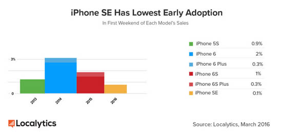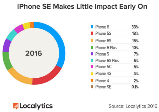 На презентации iPhone SE компания из Купертино заявила, что есть большое количество пользователей, которые предпочитают смартфоны с небольшими экранами. По данным аналитической компании Localytics, за минувшие выходные новый iPhone SE был наименее популярной моделью iPhone на рынке.