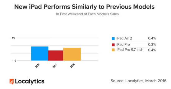 В то же время, 9,7-дюймовый iPad Pro демонстрирует хорошие результаты продаж. Гаджет занял долю в 0,4% от всех iPad, проданных в этот уикенд. Новый планшет оказался на 0,1% успешнее своего старшего собрата — 12,9-дюймового iPad Pro. Аналогичный результат в 0,4% зафиксировал iPad Air 2 во время своего дебюта.