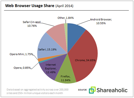 Сервис по сбору статистических данных Shareaholic обновил свой отчет об использовании веб-браузеров, отражающий изменения рынка за последние восемь месяцев. Интересным оказался тот факт, что в то время, как Chrome продолжает использоваться в качестве основного браузера для мобильных и настольных устройств, позиция Firefox сместилась со второго места на четвертое, уступив программным продуктам от Apple и Microsoft — Safari и Internet Explorer.