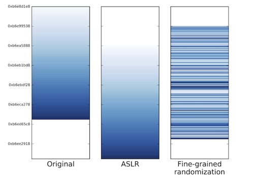 Демонстрация различий между обычным использованием памяти, технологиями ASLR и Selfrando