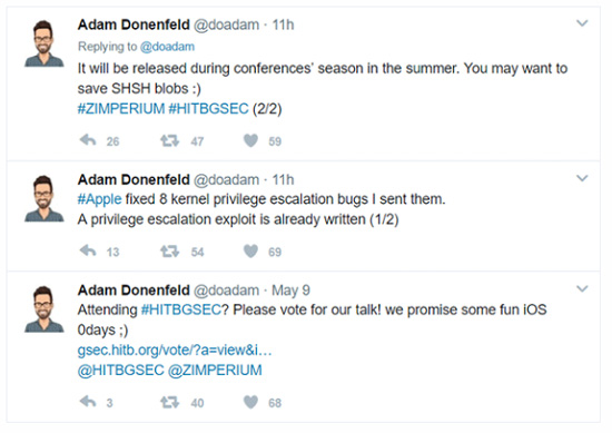 Несколько дней назад Apple выпустила финальную версию обновления iOS 10.3.2. По словам Доненфельда, в нем исправлено как минимум 8 уязвимостей, о которых он рассказал компании. Хакер планирует использовать одну из них для создания эксплоита для джейлбрейка iPhone и iPad.
