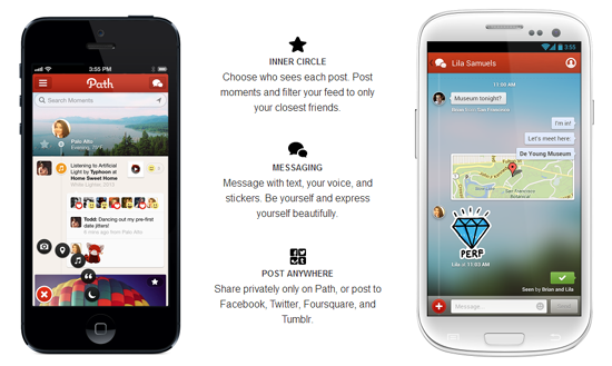 Path — это мобильное приложение, чтобы вы могли поделиться своей личной жизнью с избранным кругом лиц. В то время как крупные платформы типа Facebook и Twitter засорены сообщениями от рекламщиков, разных СМИ и от того самого человека, с которым вы не разговаривали со средней школы, Path связывает вас именно с теми людьми, от которых вы хотите получать фотографии их детей. Пусть Facebook остается шумным мегаклубом, Path будет закрытой вечеринкой для своих. Вначале пользователь мог иметь не более 50 связей, позднее их количество увеличили до 150. Пользователи хвалят дизайнерские особенности Path вроде меню, анимированных в стиле Pixar, и смайликов Emoji. Морин говорит, что эти инструменты позволяют показать настоящие эмоции, которые так трудно передать через устройства. «Сеть обеспечивают основную человеческую потребность — быть действительно близко к людям, которые вам дороги, — говорит актер и инвестор Path Эштон Кутчер. — Это моя основная социальная сеть, безопасное место, где я могу поделиться своей жизнью с теми, кого я люблю».