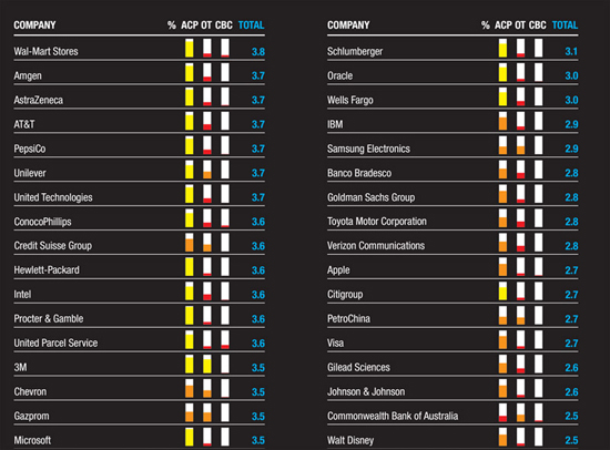 Самый высокий показатель прозрачности получила итальянская нефтегазовая компания Eni, которой специалисты отдали 7,3 очка. Британский телекоммуникационный гигант Vodafone находится на втором месте (6,7 пункта). Тройку лидеров замыкает норвежская нефтегазовая корпорация Statoil с результатом в 6,6 балла.