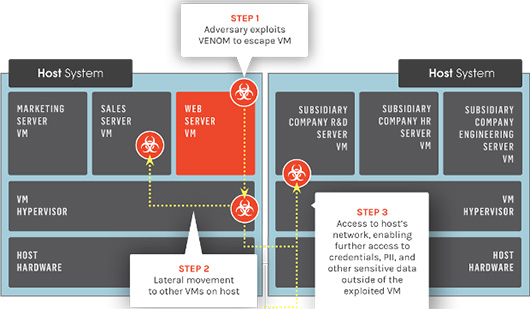 Пока нет сведений о реальных кибер-нападениях с использованием Venom. Тем не менее, Crowdstrike указывает, что этот дефект является тривиальной «дыркой» переполнения регистра памяти. Поэтому не представляет большого труда написать код, использующий данную уязвимость для взлома Linux, Mac OS X, Solaris и Windows, любой ОС с поддержкой виртуализации или гипервизоров QEMU.