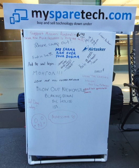 Житель Австралии по имени Линдсей Хандмер расположился на тротуаре перед магазином. В своем аккаунте в Twitter блогер описывает процесс ожидания. Один из первых твитов гласил: Я буду здесь до тех пор, пока они не попытаются избавиться от меня или пока я не куплю первый телефон». Он уже установил палатку и успел провести под магазином одну ночь.
