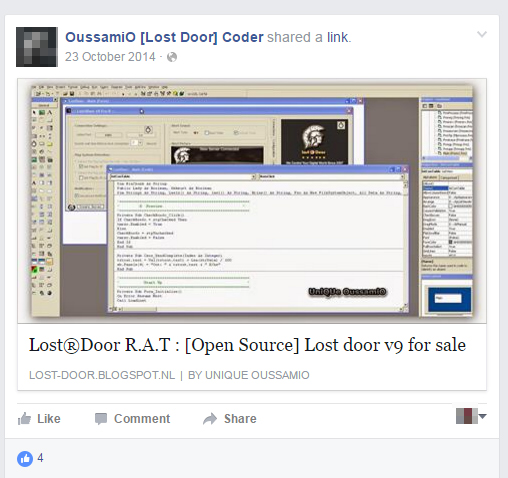 Специалисты компании Trend Micro рассказали об интересном случае, который им довелось наблюдать. Хакер, известный как OussamiO, еще в 2007 году создал RAT (Remote Access Trojan) Lost Door. Как ни странно, девять лет спустя OussamiO продолжает совершенствовать и продавать свой «продукт», при этом не ограничивая себя рекламой в даркнете. Автор малвари открыто продвигает трояна через Facebook, YouTube и Blogspot, и не похоже, чтобы это кого-то волновало.