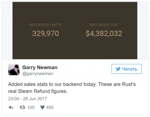 У себя в твиттере Ньюман поделился очень любопытными цифрами касательно возвратов нашумевшего симулятора выживания Rust. Как оказалось, около 330 тысяч пользователей Steam потребовали возврат средств за игру. Если перевести на деньги, разработчикам пришлось вернуть почти $4,4 миллиона. Среди причин возврата чаще всего можно встретить жалобы на технические неполадки Rust и на то, что она недостаточно весёлая. Стоит отметить, что даже такая внушительная цифра не особо сказалась на общих продажах игры — с 2013 года Rust приобрело более 5,2 миллиона человек.