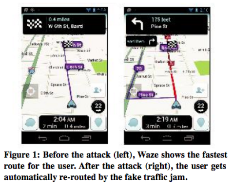 Группа исследователей из Калифорнийского университета в Санта-Барбаре обнаружила опасную уязвимость в бесплатном навигационном приложении Waze. Исследователи сумели отреверсить код Waze, что позволило им обвести серверы приложения вокруг пальца. Уязвимость помогла специалистам не только проследить за настоящими водителями в Сан-Франциско и Лос-Анджелесе, но также позволила наводнить карту тысячами автомобилей-призраков и создать виртуальные пробки.