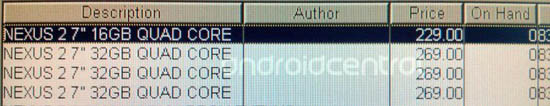 В распоряжении ресурса AndroidCentral оказался скриншот, сделанный анонимным пользователем с компьютера одной из ритейлерских сетей. В нем упоминается новая версия планшета Google Nexus 7 и, в частности, цены на его базовый вариант с 16 ГБ и 32 ГБ встроенной памяти — $229 и $269 соответственно.