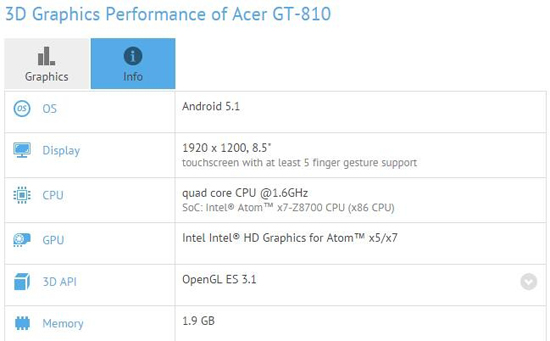 В базе синтетического теста GFXBench появилась информация о планшете под обозначением Acer GT-810. Этот гаджет, согласно данным с сайта бенчмарка, наделён дисплеем с диагональю 8,5 дюйма, разрешающей способностью 1920 × 1200 пикселей и возможностью распознавать по меньшей мере пять одновременных прикосновений пальцев. Объём оперативной и постоянной памяти составляет 2 и 32 Гбайт соответственно.