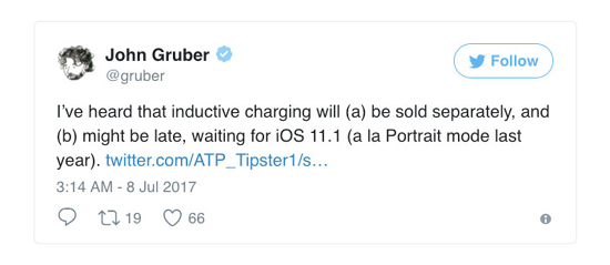 «Я слышал, что индуктивная зарядка [для iPhone 8] (a) будет продаваться отдельно и (b) – возможно, придется подождать выхода iOS 11.1 (а-ля портретный режим в прошлом году)», – написал Грубер.