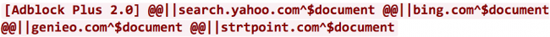 Владельцы компьютеров Mac, использующие антирекламное ПО, всё равно подвержены связанным с ним рискам. К такому выводу пришёл специалист по информационной безопасности Дэвин Берд. Невзирая на некоторую очевидность данного утверждения, основания для беспокойства имеются: установка приложений вроде AdBlock быстро приучает к мысли, что ничего из нечестной рекламы — вроде той, где предлагается загрузить что-то непонятное — на компьютер не попадёт. Вся проблема заключается в том, что многие разработчики нежелательного ПО уже нашли обходной путь и могут запросто добавить свои творения в список исключений, причём практически незаметно для пользователя. То есть «мусорные» программы (называются два вида, VSearch и Genieo) научились создавать собственные правила для плагинов и, как следствие, для оснащённых ими браузеров. Для этого вредители проникают на компьютер под видом «обычных» приложений и оперируют подобным этому кодом.
