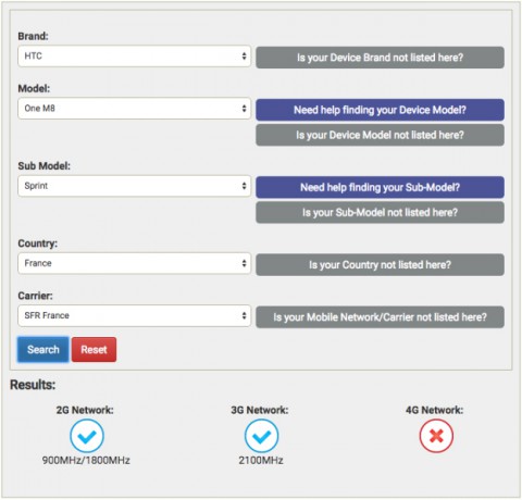 На скриншоте ниже представлена информация о работе HTC One (M8) в версии оператора Sprint с SFR France. Как видно из примера, у пользователя телефона будет доступ к 2G- и 3G-сетям, а к LTE-соединение доступно не будет.