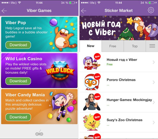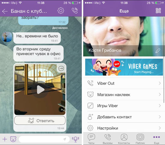 Viber, мне кажется, является самым функциональным из всех подобных приложений, которые присутствуют на iOS. Это ультимативный мессенджер, в котором доступно абсолютно всё — от сообщений до видеозвонков. Да, с возможностью пополнить счет на любую сумму от $0,99 прямо из программы. Кроме новой и уникальной функции Паблик чатов, о которой мы вам недавно рассказывали, здесь есть поддержка анимационных сообщений и стикеров со специальным магазином. Там можно загрузить дополнительные паки с картинками-стикерами. С недавних пор Viber также поддерживает игры, которые нужно отдельно скачивать из App Store. Никто из лучших сервис онлайн-общения не предлагает таких возможностей.