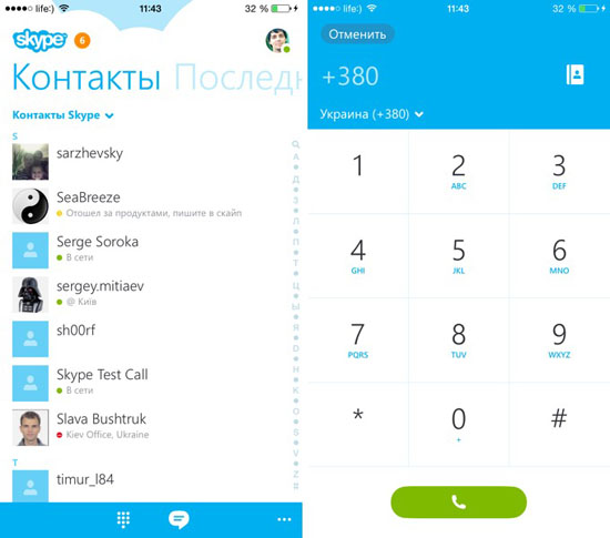 Весь интерфейс приложения Skype для iPhone напоминает новую версию программы для компьютеров. Перед глазами список последних чатов, внизу кнопки нового чата и набора номера, есть эффектный переход между разговорами, контактами и списком избранных с помощью свайпов влево-вправо. Собственно, всё неплохо, кроме того, что Skype в таком виде — чужеродная программа для iOS в таком виде, так как эксплуатирует идеи интерфейса приложений под Windows Phone. Привыкли к стандартным мессенджерам? Придется переучиваться ради Skype.