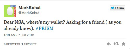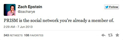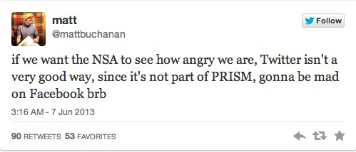 Мэтт Бучанан, журналист New Yorker: «Если мы хотим показать АНБ нашу злость, то Twitter не лучшее место — он же не входит в состав PRISM. Пойду поагрюсь на фейсбуке, скоро вернусь».
