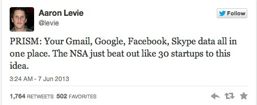 Аарон Леви, CEO Box.com: «PRISM: вся ваша инфа из Gmail, Google, Facebook, Skype в одном месте. АНБ только что превзошла около 30 стартапов схожей направленности».